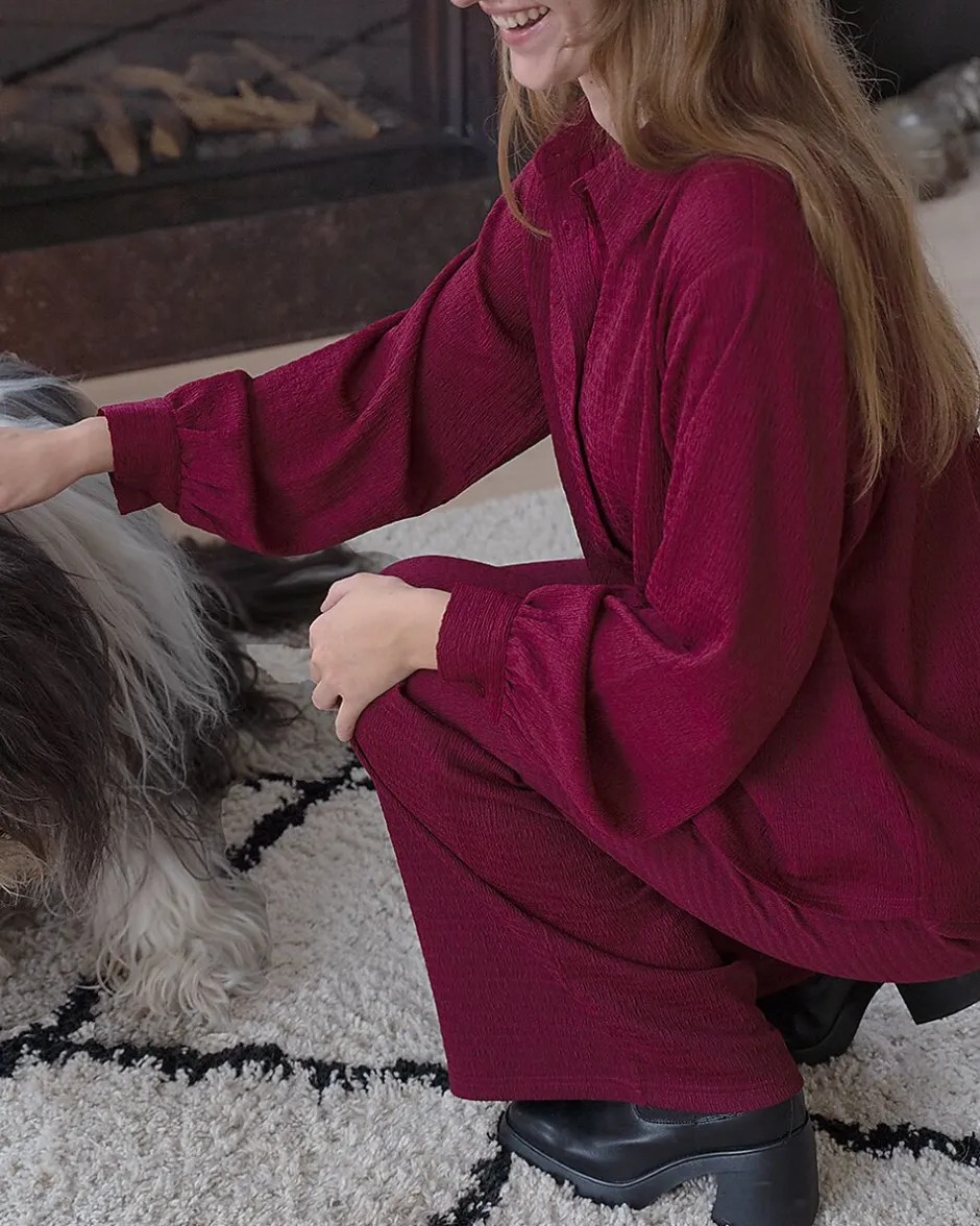 Cette blouse pour femme est d’un rouge profond. Elle a un col, des manches longues avec une fermeture à bouton au poignet et une rangée de boutons sur le devant. Le tissu souple offre un ajustement confortable. Son design simple rend cette blouse adaptée à différentes occasions.