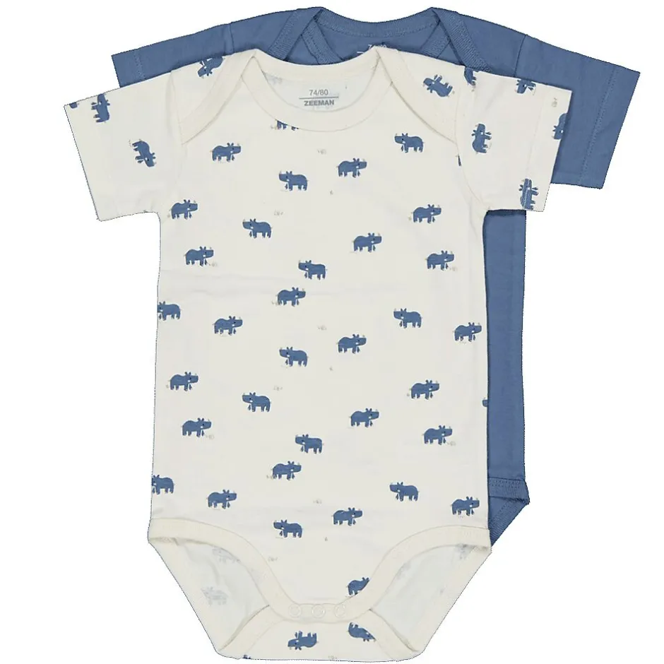 Ce lot de 2 bodys pour bébé comprend un modèle bleu uni et un blanc avec un motif d’animaux bleu. Les manches courtes offrent une grande liberté de mouvement. Le tissu doux est composé à 97 % de coton et 3 % d’élasthanne, ce qui rend les bodys agréables et légèrement extensibles. Ils s’enfilent ainsi facilement et restent bien en place.