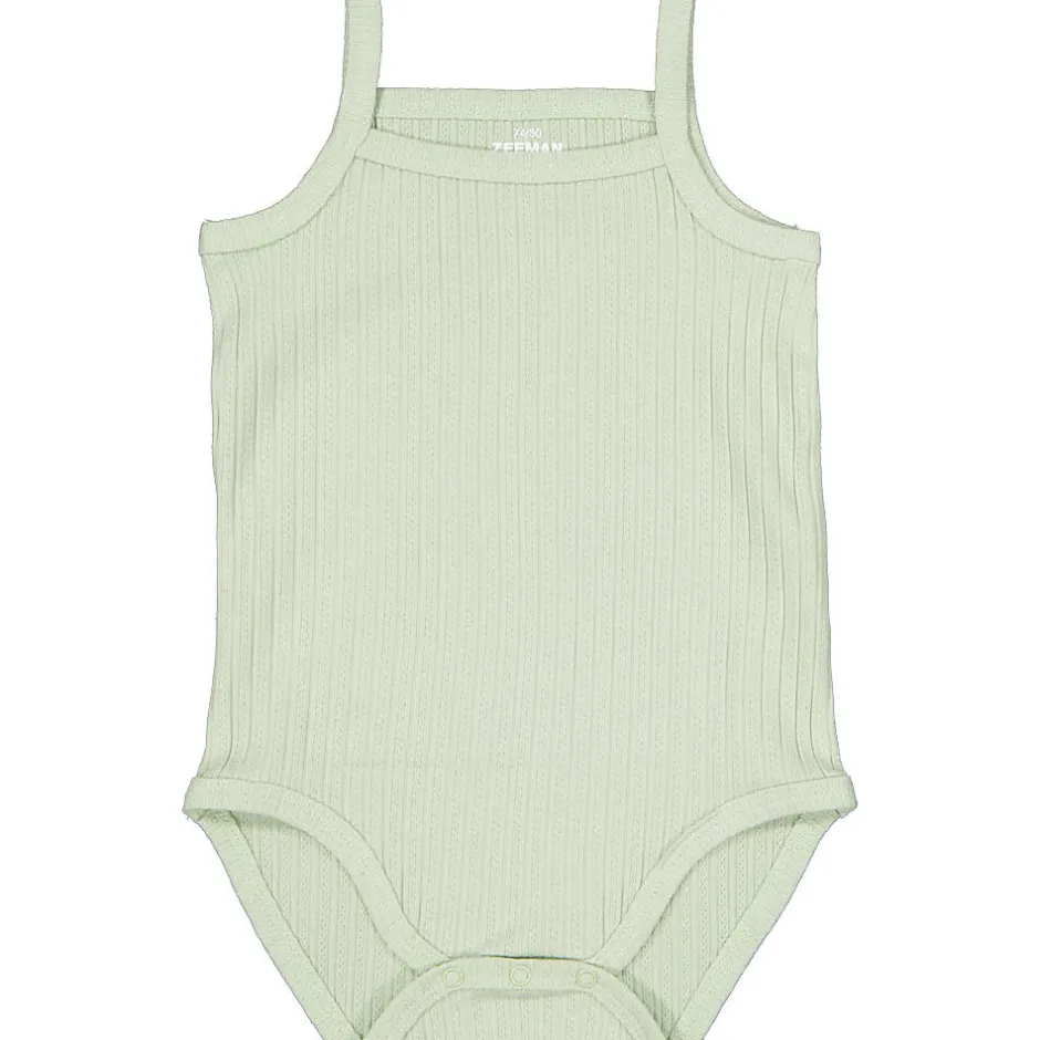 Cette combinaison bébé est fabriquée en 95% coton et 5% élasthanne. Le tissu pointelle est doux et agréable à porter. Elle est sans manches et de couleur vert clair. Une combinaison bébé est un vêtement polyvalent. Elle peut se porter comme sous-vêtement quand il fait plus frais, ou comme vêtement seul pendant les jours plus chauds. Cette combinaison en vert clair reste bien en place grâce à sa forme en une seule pièce. Le dos et le ventre restent couverts, même quand le bébé roule, joue ou rampe, et sa température reste plus stable. Le sous-vêtement, comme la couche, reste aussi mieux en place. Les boutons-pression au bas permettent de l’enfiler et de l’enlever facilement, ce qui est pratique pour changer une couche rapidement. Cette combinaison est sans manches. Cela la rend facile à porter sous presque tous les vêtements, mais aussi seule pendant les journées chaudes. Le tissu est composé de 95% coton et 5% élasthanne. Le coton est un tissu agréable, même pour les jours plus chauds, car il laisse mieux respirer la peau, absorbe l’humidité et sèche rapidement. Il est aussi plus résistant grâce à sa structure. Le tissu est souple et offre davantage d’élasticité grâce à l’ajout d’élasthanne. Cela donne au bébé plus de liberté de mouvement pour rouler, ramper et jouer.
