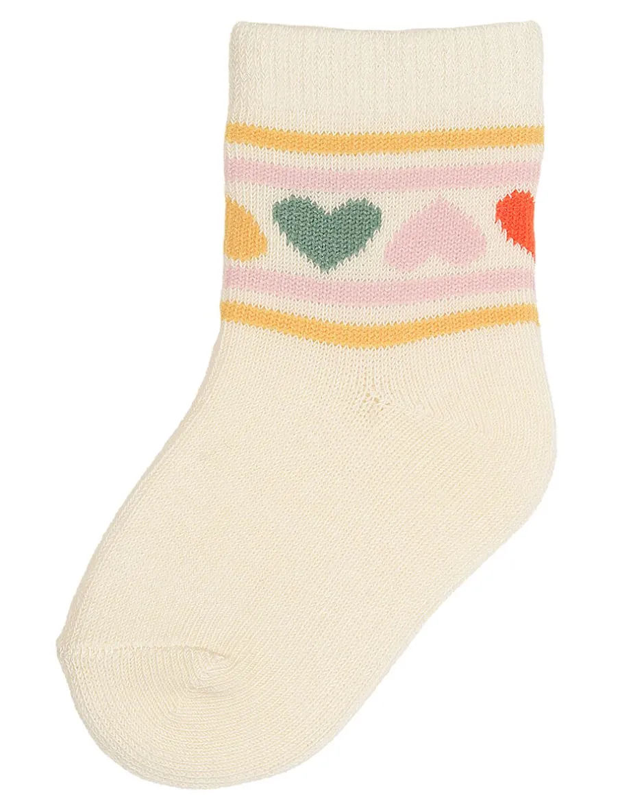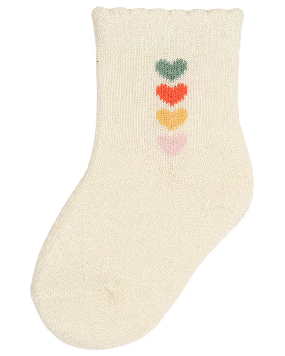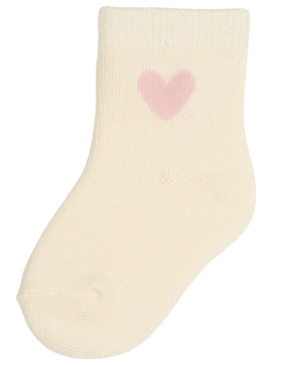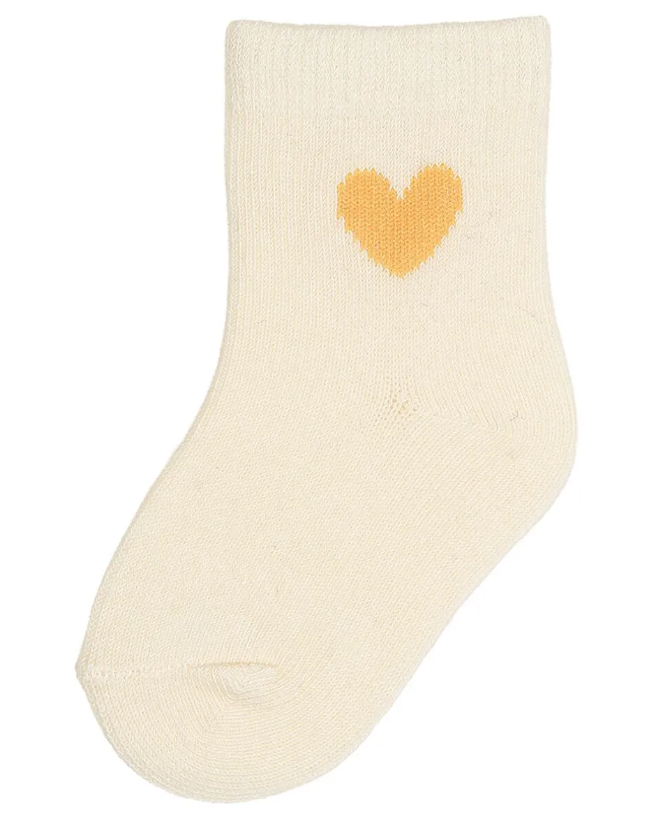 Cet ensemble de cinq paires de chaussettes pour bébé beige est fabriqué en coton, polyester et un peu d’élasthanne. Le tissu est doux et légèrement extensible, ce qui les rend agréables à porter. Chaque chaussette a un motif de petits cœurs de différentes couleurs, pour un effet simple et ludique. Les bords tiennent bien en place, pour que les chaussettes restent aux pieds et gardent les petits pieds au chaud.