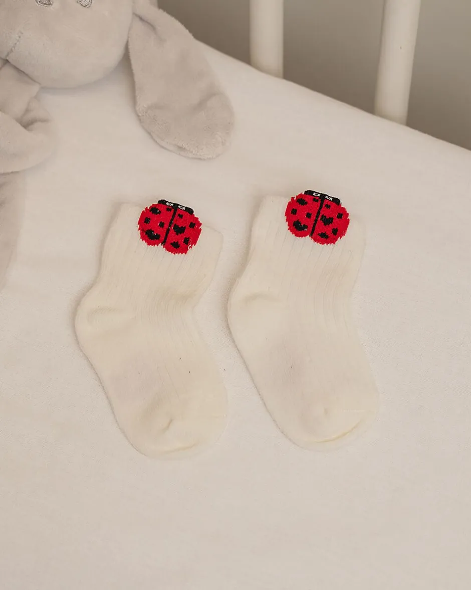Ces chaussettes blanches pour bébé ont une coccinelle rouge à pois noirs en haut. Elles sont faites de 73 % de coton biologique, 25 % de polyamide et 2 % d’élasthanne. Cela les rend douces et légèrement extensibles. Elles sont agréables à porter et tiennent bien en place. Grâce à leur coupe confortable, vous pouvez les mettre tous les jours.