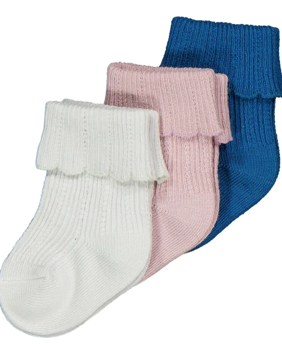 Cet ensemble se compose de trois paires de chaussettes en blanc, rose clair et bleu foncé. Elles sont faites dans un mélange doux de coton, polyester et élasthanne, ce qui les rend confortables et extensibles. Le revers à bord ondulé permet aux chaussettes de bien rester en place sans serrer. Ainsi, les pieds des bébés restent bien au chaud et protégés.