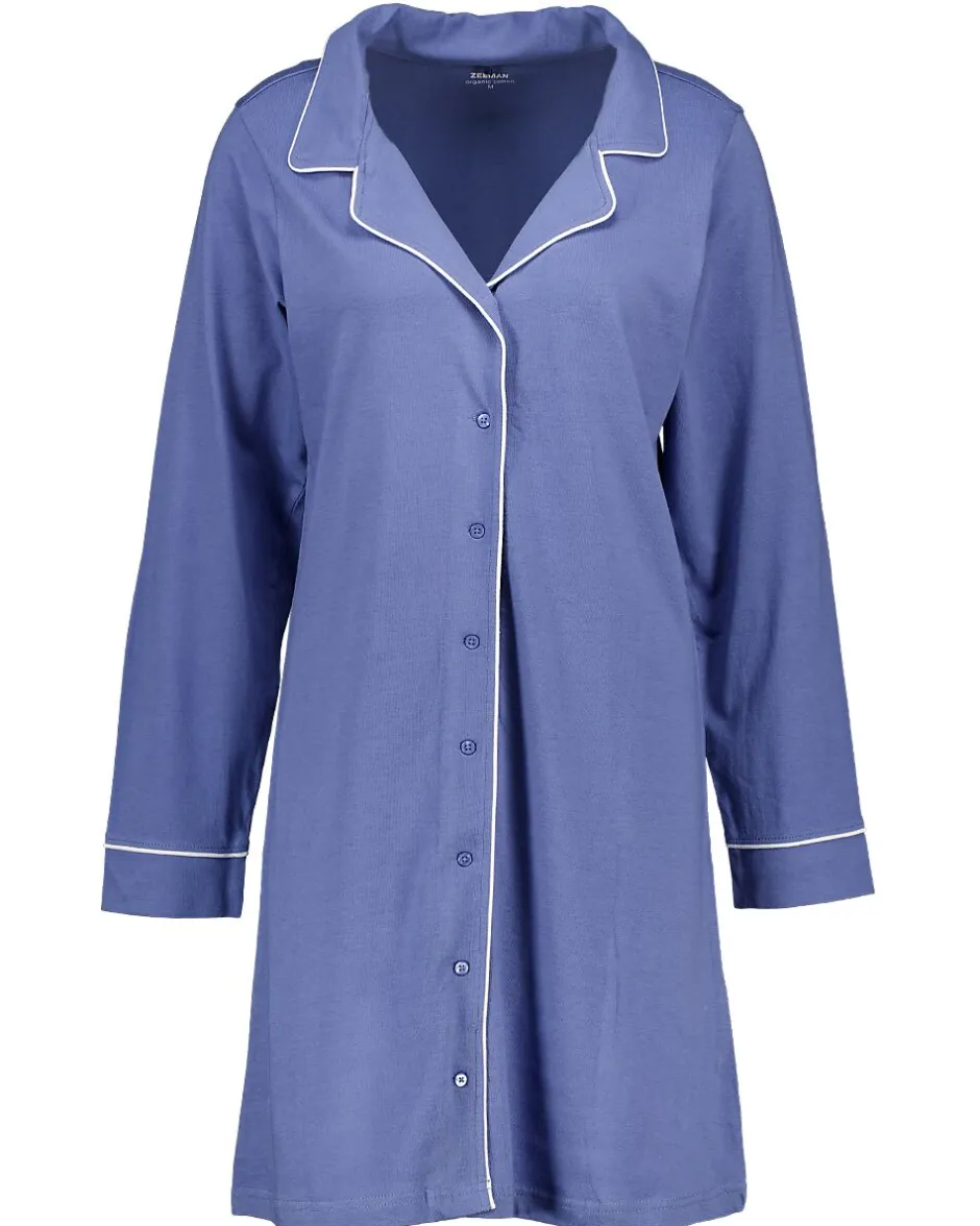 Cette chemise de nuit pour femme est bleu foncé et fabriquée en coton biologique à 100 %. Le tissu jersey simple est souple et doux, ce qui vous permet de dormir confortablement. Grâce aux manches longues et à la fermeture boutonnée sur le devant, la chemise de nuit est facile à mettre et à enlever. Le modèle uni avec de légers liserés apporte une touche de simplicité.