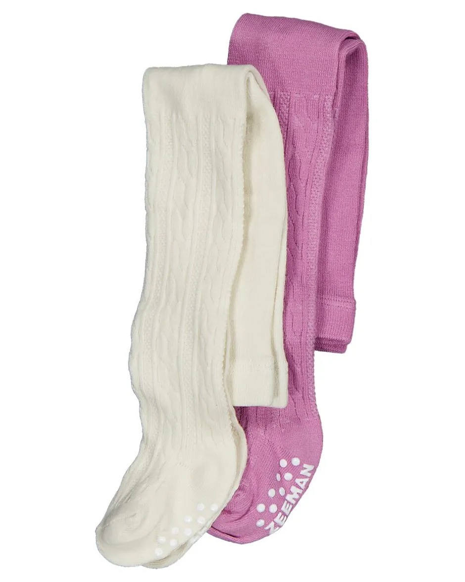 Cet ensemble comprend deux paires de collants pour bébé, en violet et en blanc cassé. Les deux modèles présentent une structure côtelée et sont confectionnés dans un mélange doux de coton, polyamide et élasthanne. La version violette est dotée de picots antidérapants sous le pied pour une meilleure adhérence. Grâce à la matière élastique, les collants s’ajustent parfaitement et offrent un grand confort lors des mouvements.