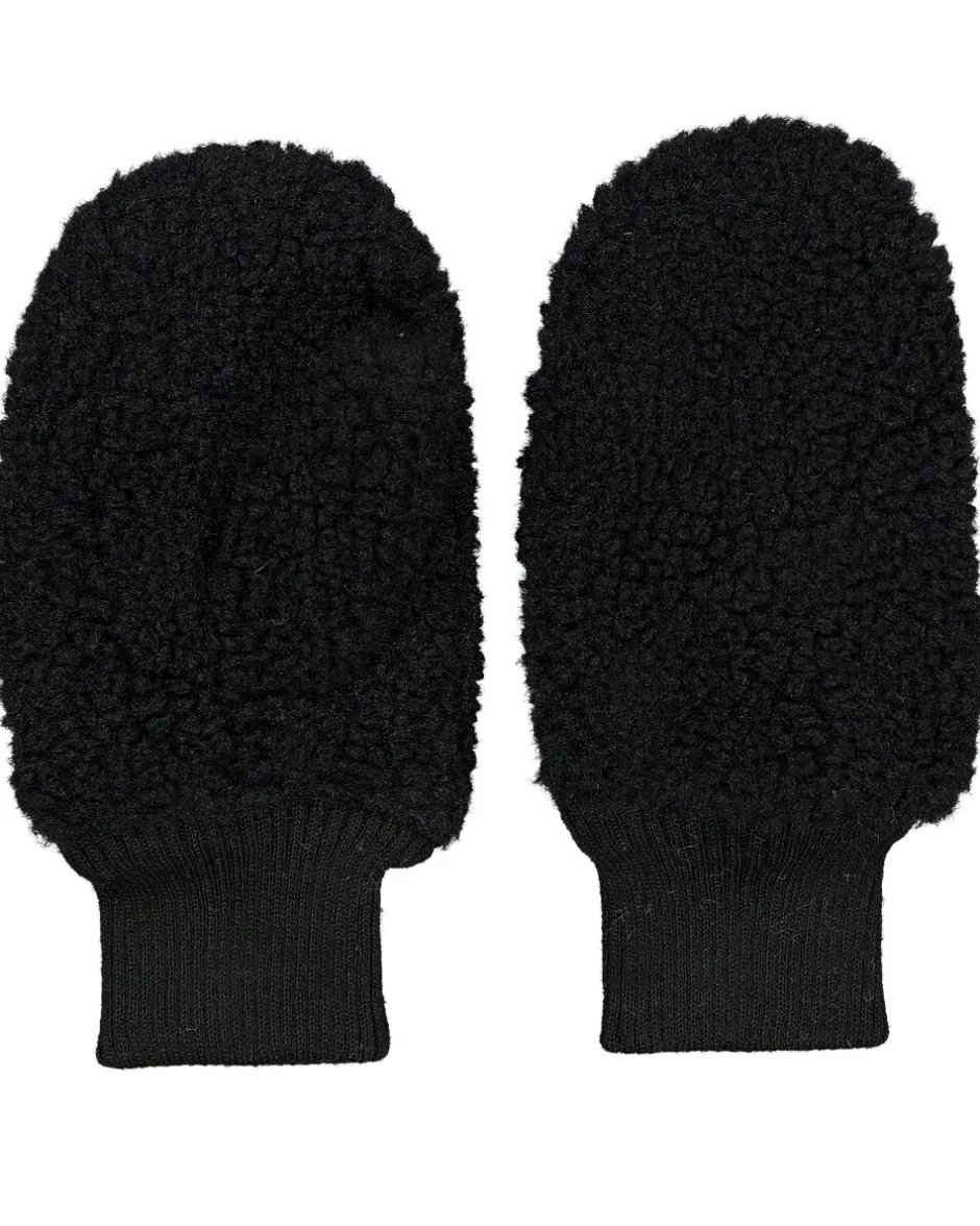 Ces moufles noires sont faites dans un tissu doux façon peluche et ont un bord côtelé au poignet. Grâce à la coupe ajustée autour du poignet, les moufles restent bien en place et les mains sont protégées du froid.