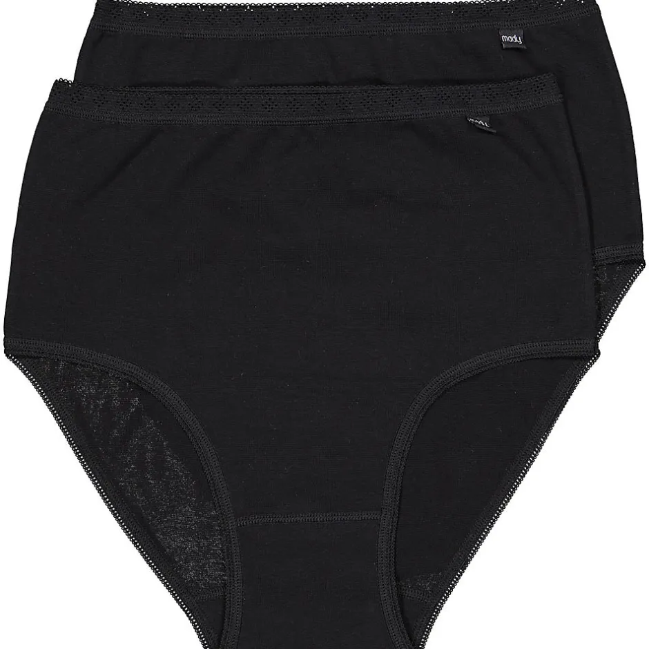 Nos culottes Mady sont populaires depuis de nombreuses années grâce à leur design confortable à taille haute et à leur matière extensible. La culotte remonte bien au niveau de la taille pour un meilleur maintien. La taille élastiquée est large et douce, elle ne serre donc pas la peau et maintient la culotte noire bien en place. Les coutures ont une finition lisse et ne frottent pas désagréablement contre la peau. Beaucoup de nos clientes portent également cette culotte comme sous-vêtement de grossesse ou post-accouchement. Le lot contient deux culottes.