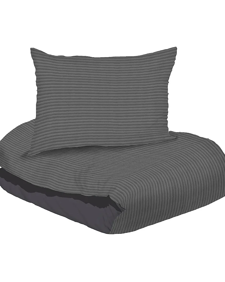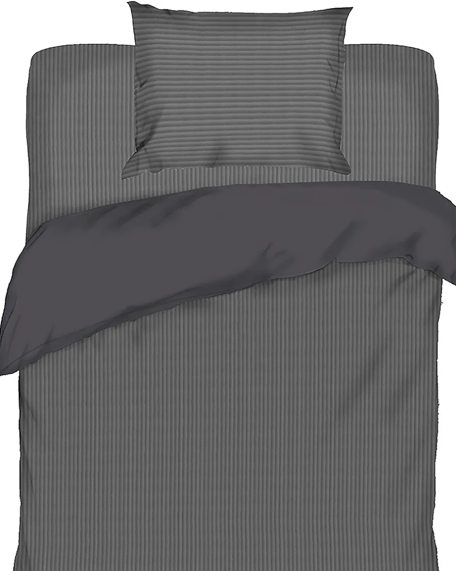 Parure de lit en velours avec un côté au motif subtilement rayé et l’autre côté uni. La parure est douce au toucher et convient pour un lit une personne de 140 cm de large et 200 cm de long. Grâce à son design épuré, cette parure s’intègre bien dans différentes chambres.