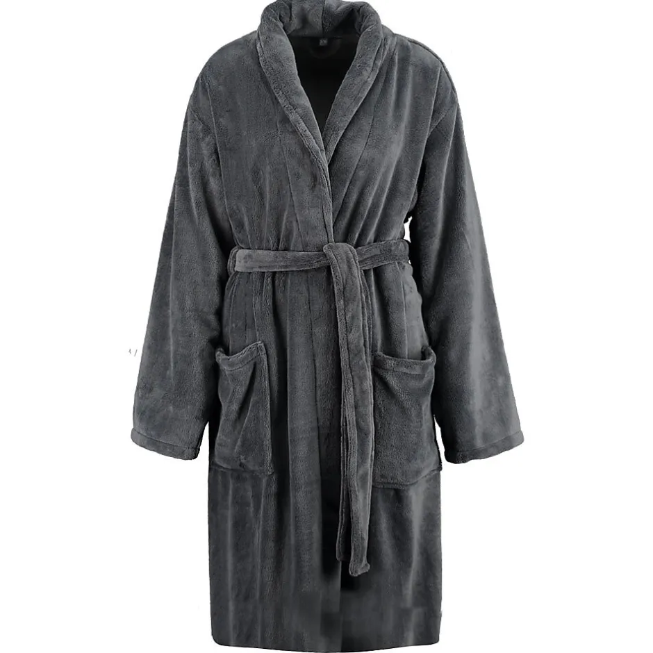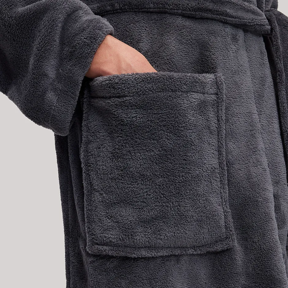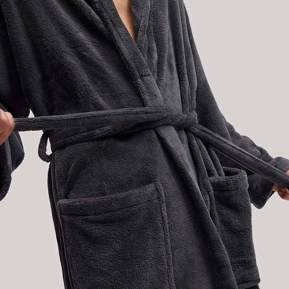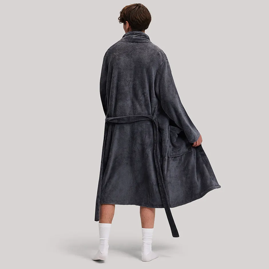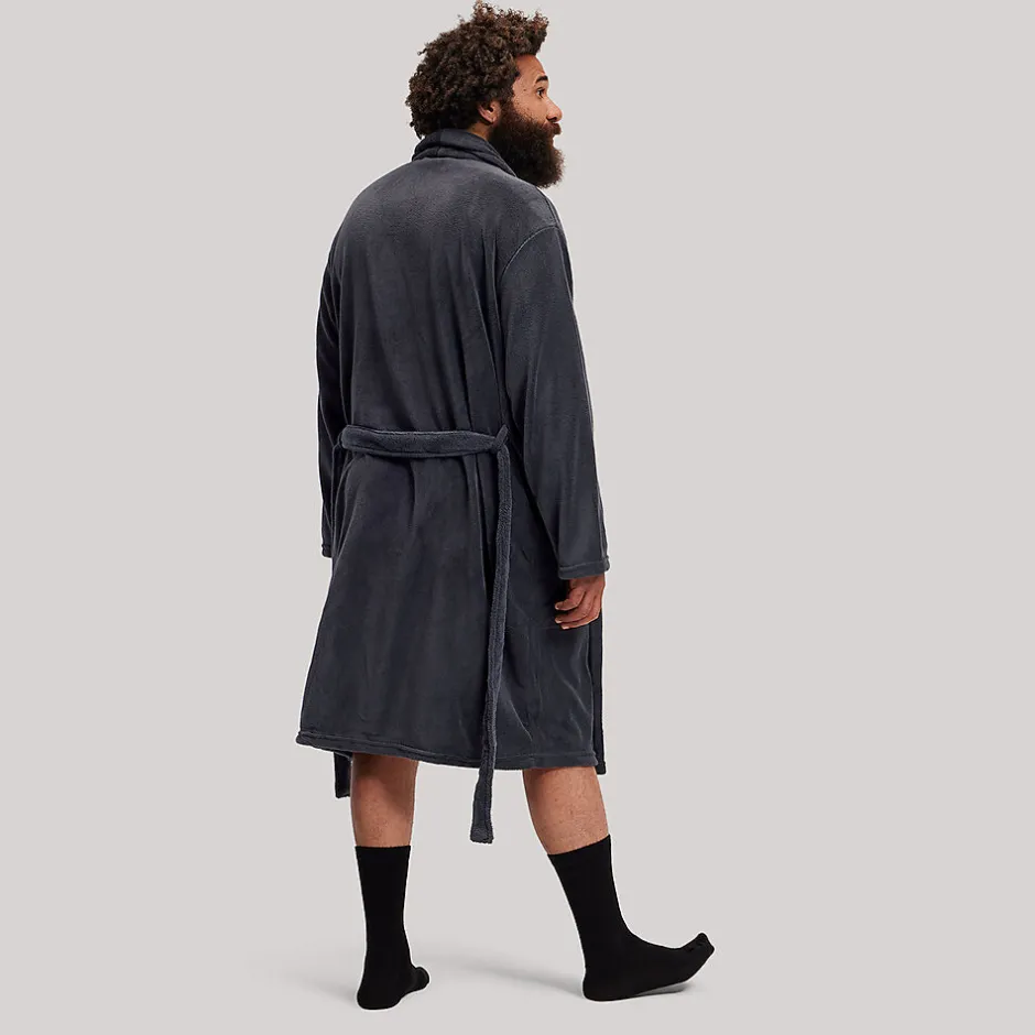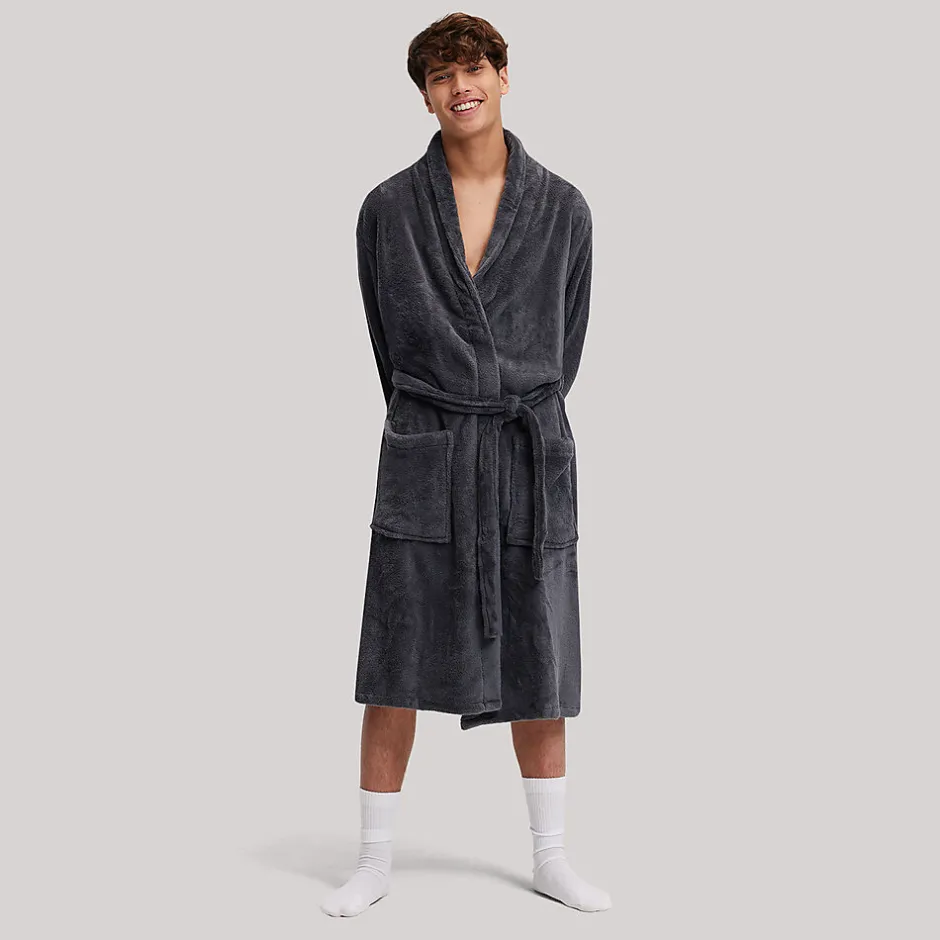 Ce peignoir gris est fabriqué en polaire toucher peluche tout doux. Le tissu est agréablement chaud, légèrement brillant et souple. Cela rend le peignoir agréable à porter. Il descend jusqu’en dessous du genou et présente une coupe droite qui offre suffisamment de liberté de mouvements. Des cordons de serrage à l’intérieur permettent de maintenir les deux côtés bien en place et fermés. Le peignoir se ferme sur l’extérieur à l’aide d’une ceinture. Le col large apporte une chaleur supplémentaire au niveau du cou. Les deux poches sur les côtés peuvent accueillir de petits objets ou vous réchauffer les mains. Et la couleur grise unie s’accorde avec tout. Un basique indispensable pour les soirées sur le canapé ou le petit-déjeuner du dimanche.