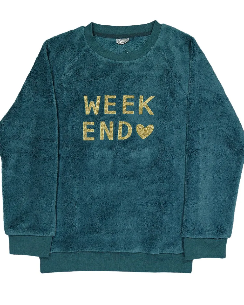 Ce twosie bleu pour fille est fabriqué en coral fleece doux, composé à 100 % de polyester. Le pull a un col rond et un message de week-end avec un cœur. Le pantalon a un motif à carreaux bleu et blanc. Grâce à sa matière chaude et confortable, cet ensemble est agréable à porter à la maison lors d’une journée de détente. Pratique pour les jours froids et facile à entretenir.