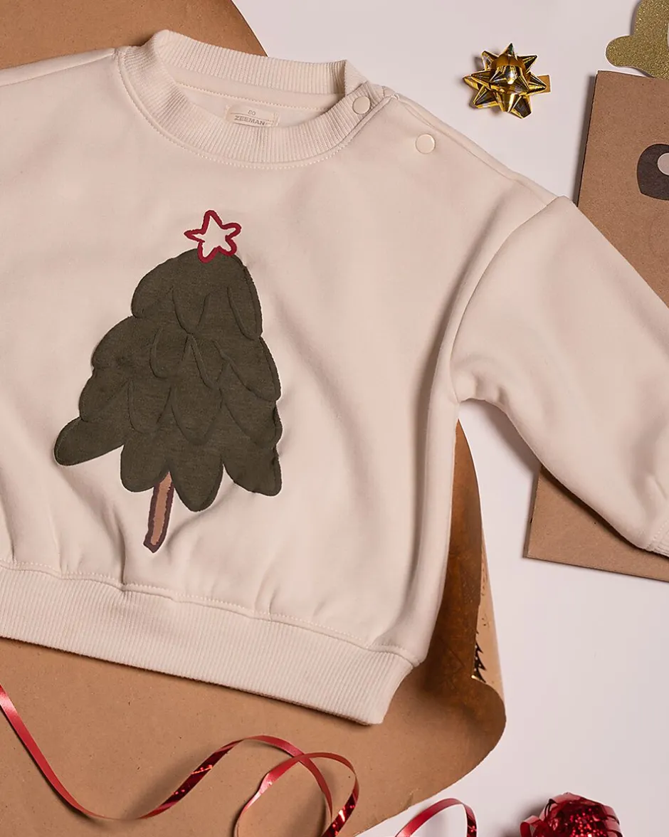 Ce sweat beige pour bébé est fabriqué dans un tissu doux à l’intérieur, ce qui le rend confortable à porter. Le pull a des manches courtes et un col rond. Sur le devant, il y a une application d’un sapin vert avec une petite étoile rouge. La large bordure en bas assure une bonne tenue. Convient pour un usage quotidien.