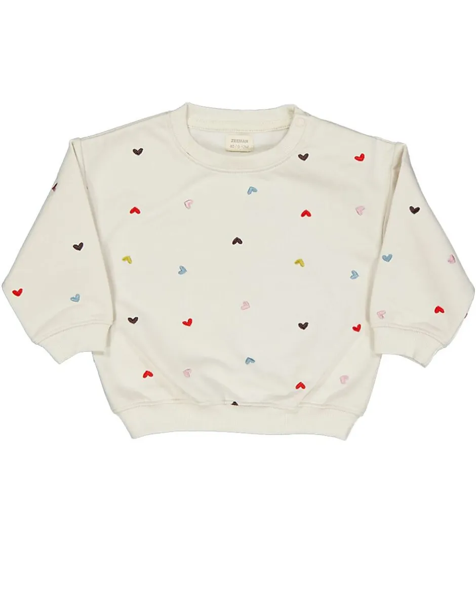 Ce pull beige pour bébé est fabriqué dans une matière douce et présente un motif joyeux avec de petits cœurs de différentes couleurs. Le pull a un col rond et des manches longues, ce qui apporte du confort et permet de l’enfiler et de le retirer facilement. Grâce au tissu souple, votre bébé peut bouger librement pour jouer ou se détendre.