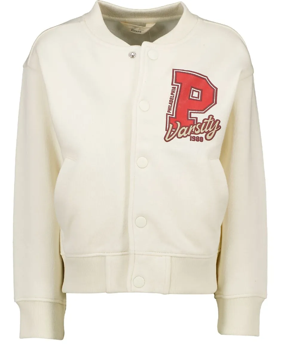 Ce gilet beige pour fille est en polaire tricotée et a des manches longues. Il se ferme devant avec des boutons-pression et comporte une grande impression rouge avec la lettre P et le mot « Varsity ». L’encolure, les manches et le bas sont finis avec un bord large pour plus de confort. Pratique à enfiler rapidement sur un t-shirt ou un pull.