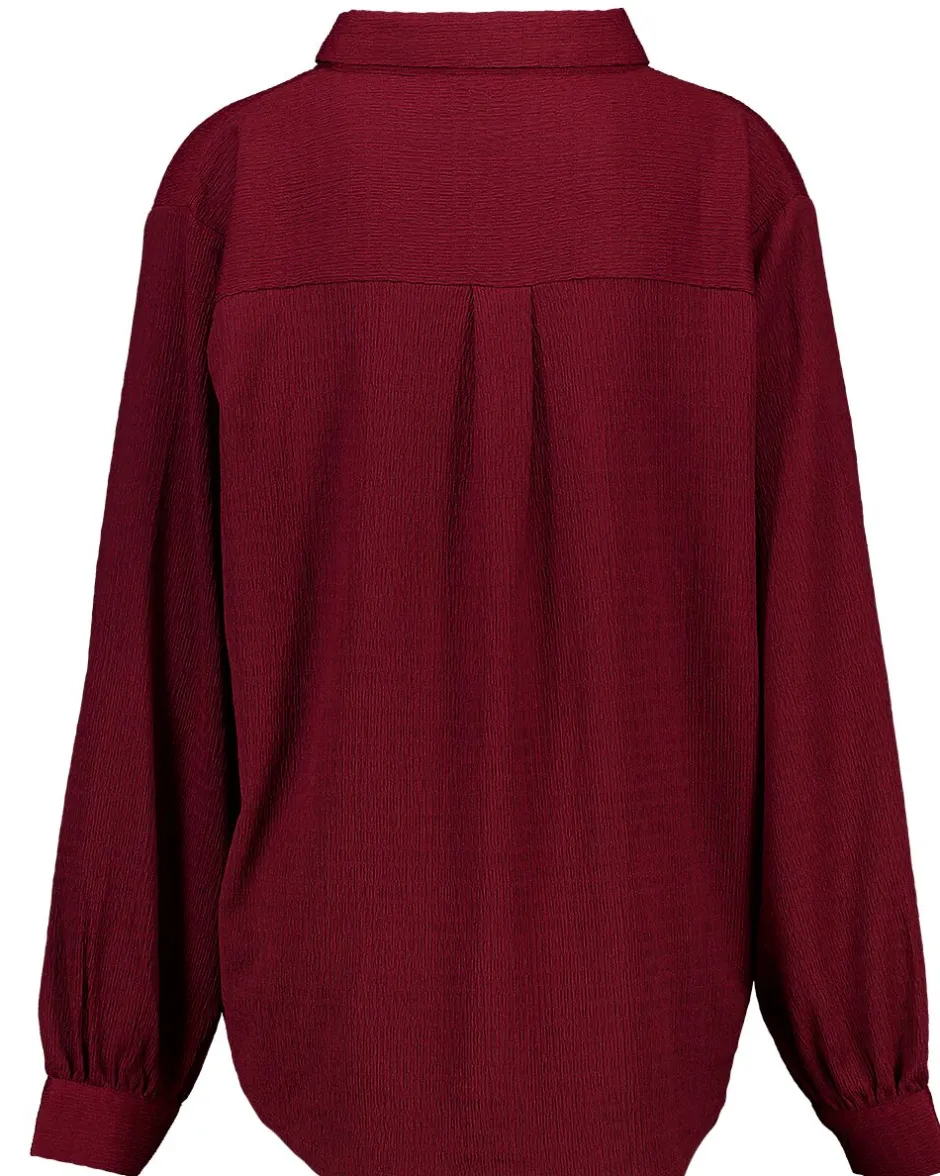 Cette blouse pour femme est d’un rouge profond. Elle a un col, des manches longues avec une fermeture à bouton au poignet et une rangée de boutons sur le devant. Le tissu souple offre un ajustement confortable. Son design simple rend cette blouse adaptée à différentes occasions.