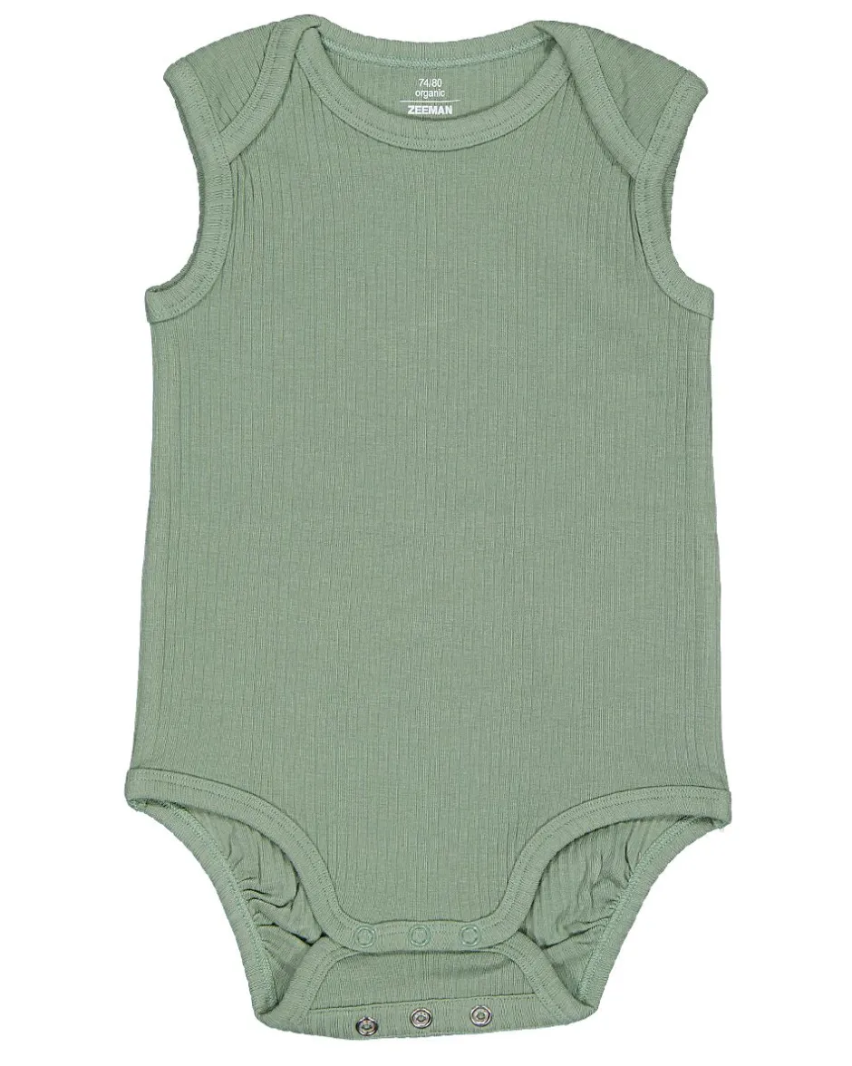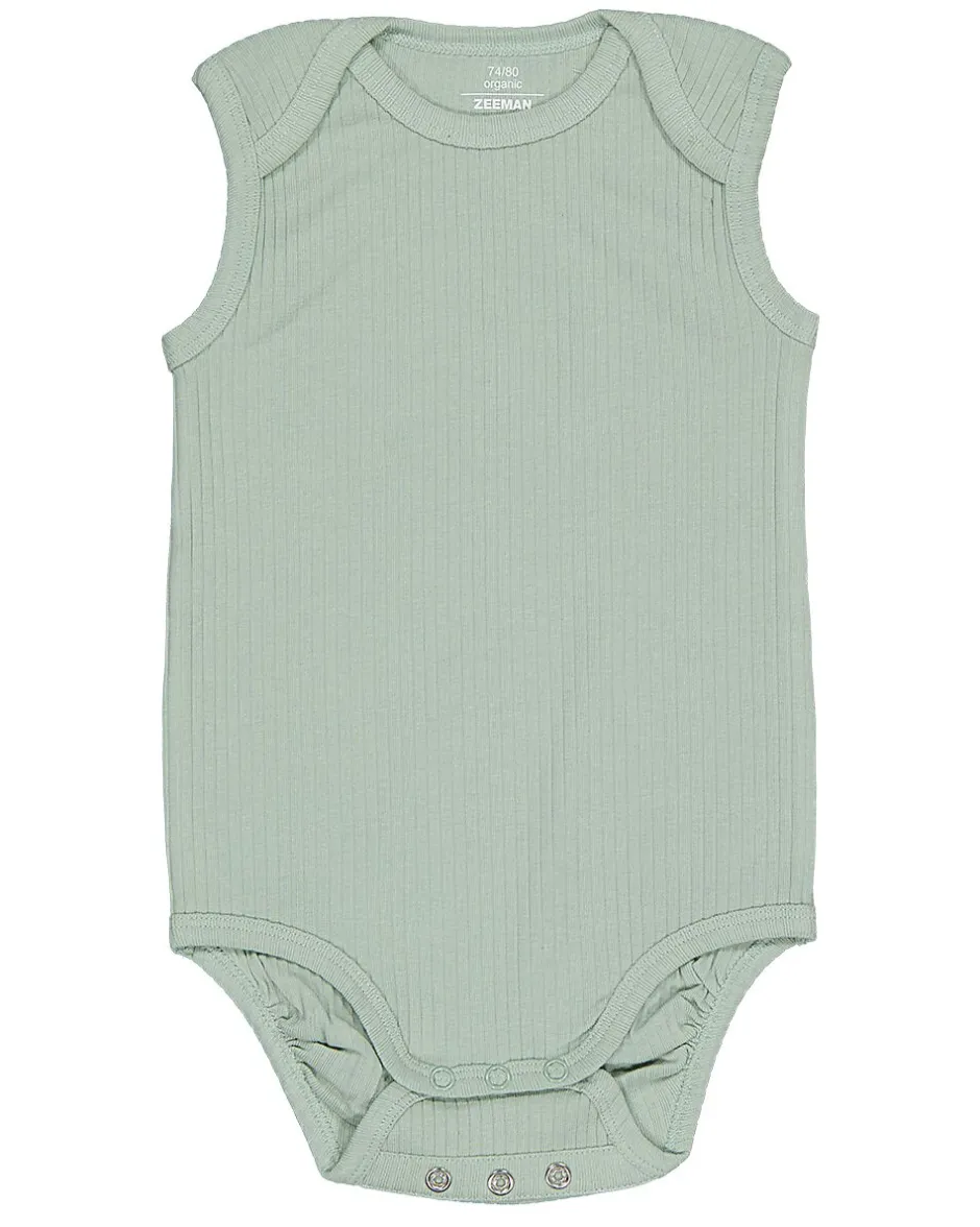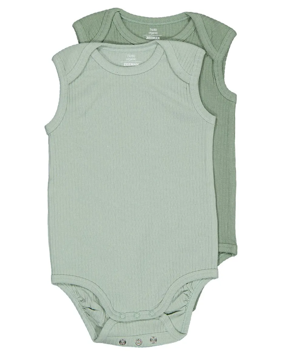Cet ensemble de deux bodies verts pour bébé est en coton avec un peu d’élasthanne, ce qui rend le tissu doux et légèrement extensible. Le modèle sans manches permet de bouger facilement quand il fait chaud. Les bodies se ferment par des boutons-pression en bas, pour les enfiler et les retirer rapidement.