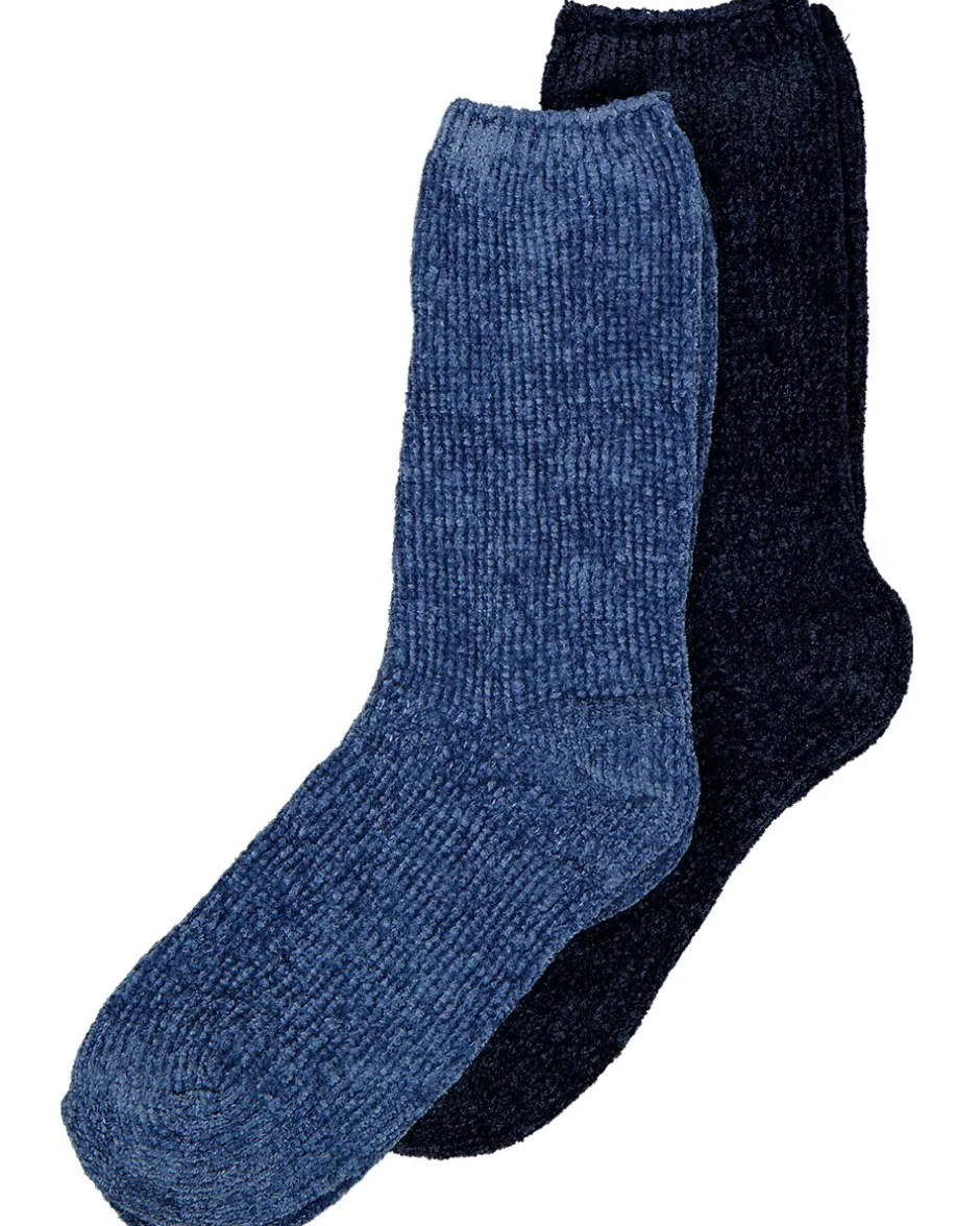 Ces chaussettes d’intérieur pour femme sont faites dans une matière douce et tricotée, avec deux tons de bleu. Grâce à la composition de 97 % polyester et 3 % élasthanne, les chaussettes sont confortables et élastiques. Elles gardent les pieds au chaud et sont agréables à porter à la maison. Le lot contient deux paires, sans motif ni décoration, adaptées à un usage quotidien.