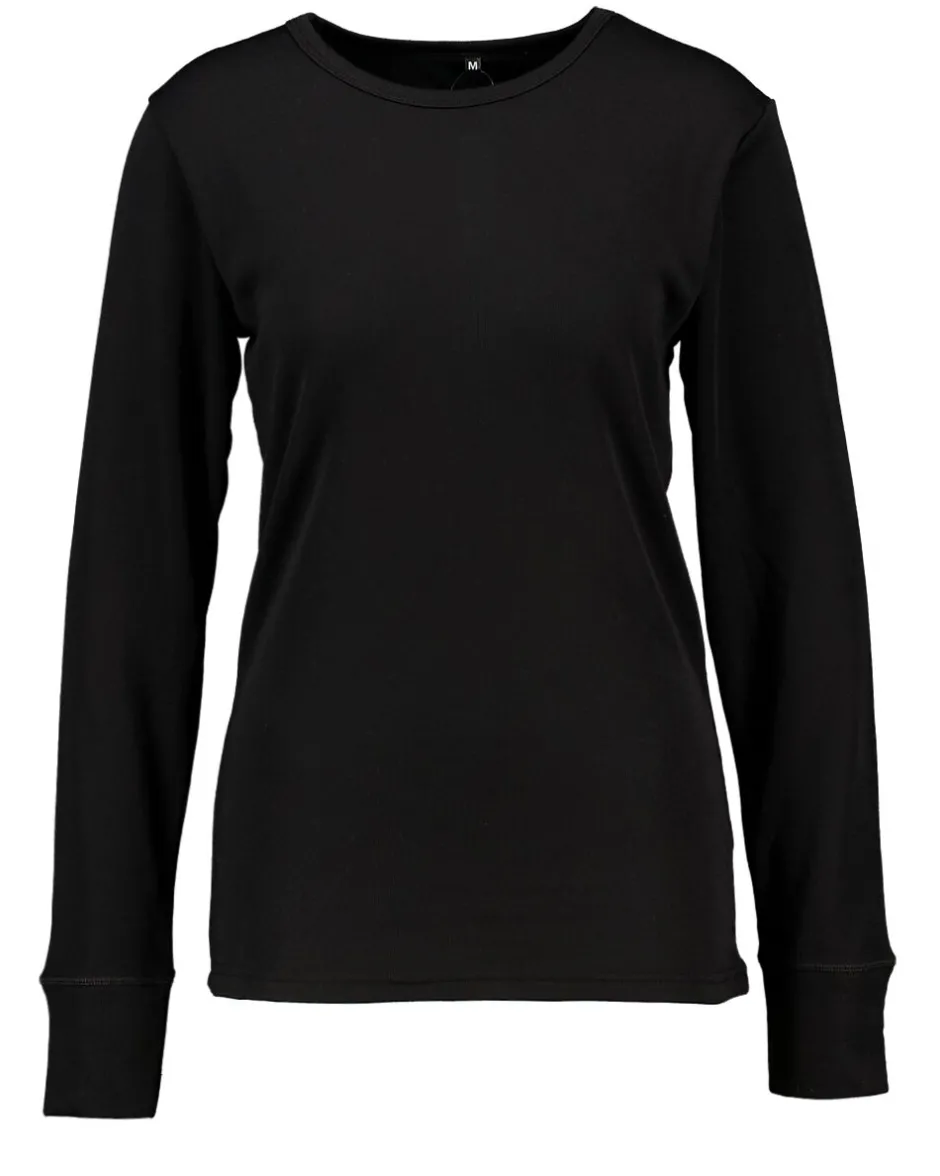 Ce T-shirt noir pour femme à manches longues et à col rond est en polyester. Le tissu solide est confortable et garde bien sa forme. Grâce à sa structure côtelée et à ses propriétés thermiques, le T-shirt s’ajuste bien et vous aide à rester au chaud les jours froids.