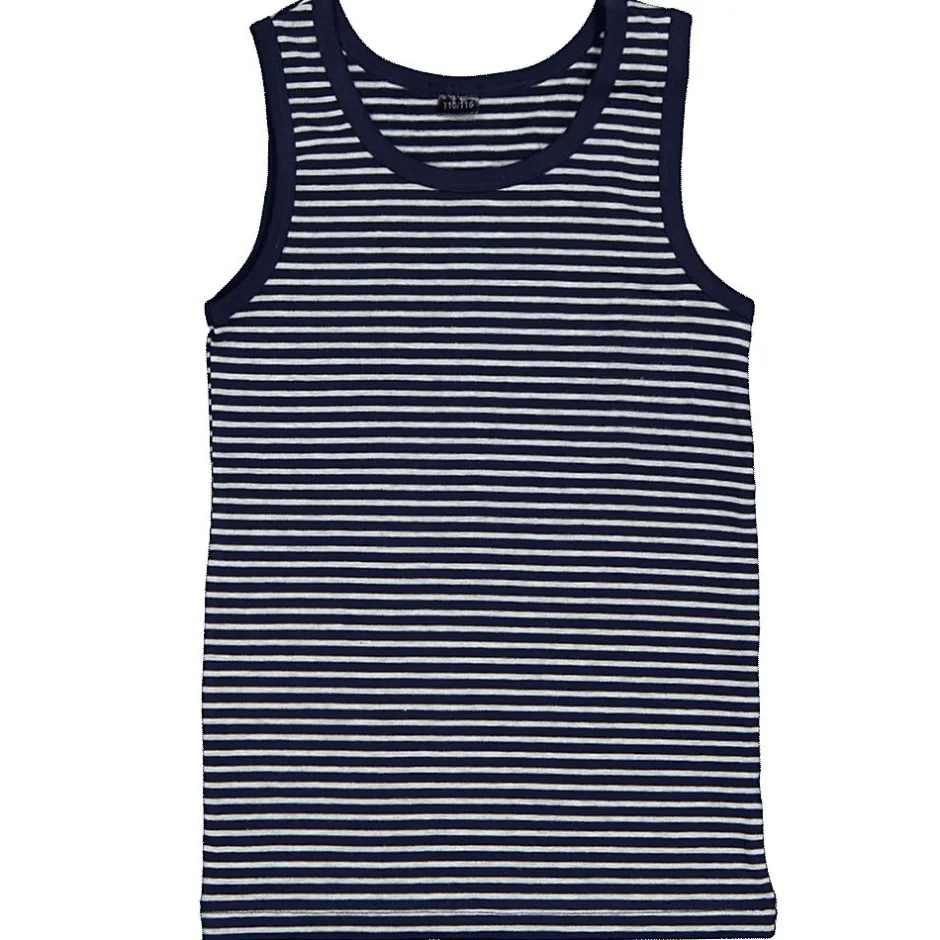 Ce maillot de corps sans manches pour garçon a des rayures bleu foncé et blanches. L’encolure ronde et les emmanchures sont finies avec des bordures bleu foncé, ce qui le rend agréable à porter. Le coton mélangé à un peu d’élasthanne rend le maillot légèrement extensible, pour bien suivre les mouvements et offrir un bon confort. Ce maillot peut se porter seul ou sous un t-shirt.