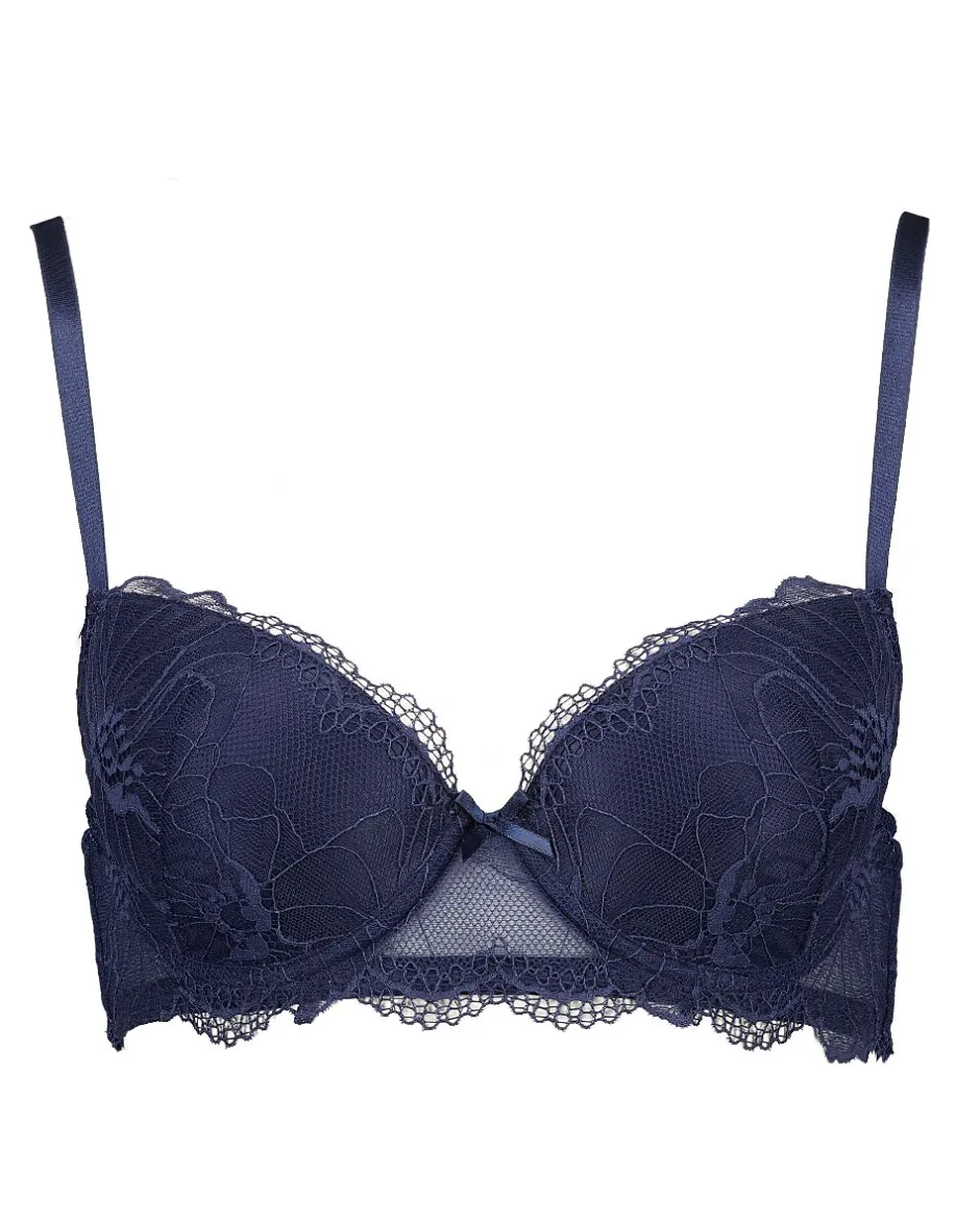 Ce soutien-gorge bleu préformé pour femme est en dentelle et possède des bretelles réglables pour un bon ajustement. Les bonnets légèrement rembourrés et l’armature offrent un bon maintien. Le motif floral discret dans la dentelle et la finition soignée donnent un aspect soigné. Il se ferme dans le dos avec une agrafe. Fabriqué en polyamide et élasthanne, il est confortable et extensible.