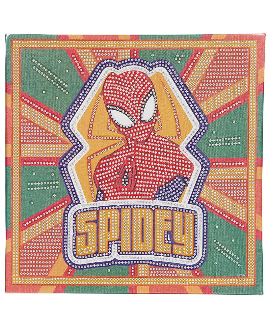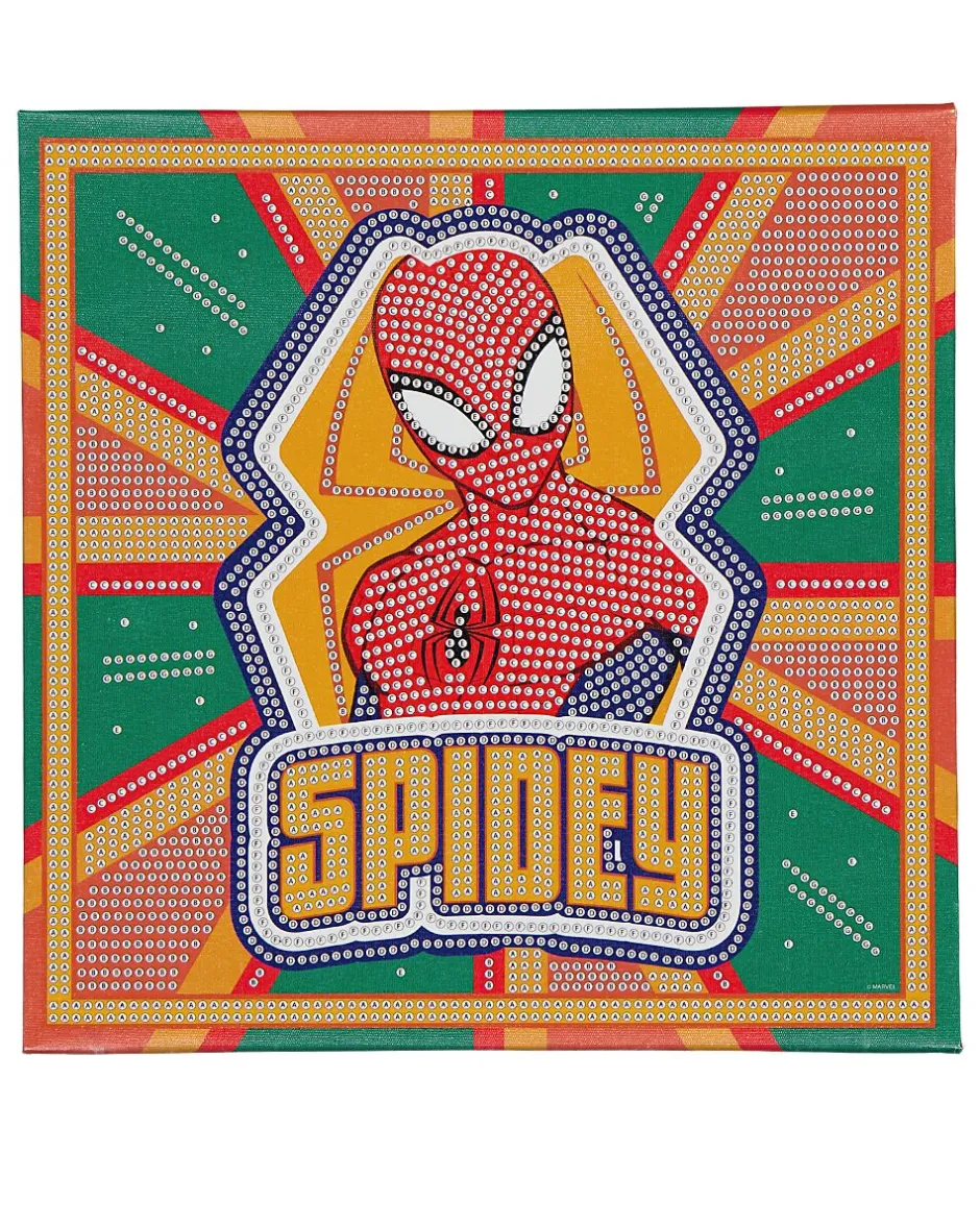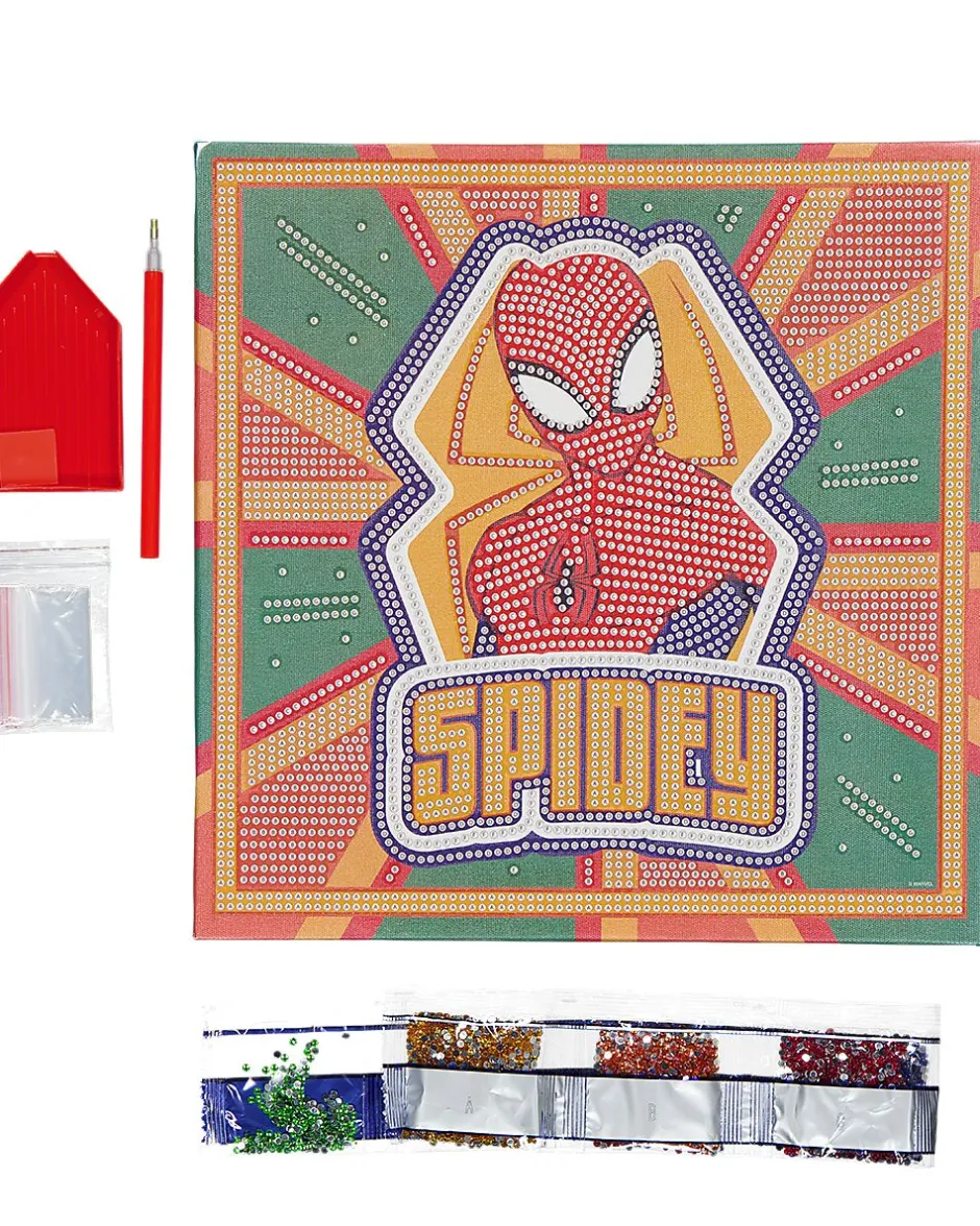 Cette peinture diamant en bleu mesure 29 sur 29 centimètres. Sur l’image, on voit un personnage avec de grands yeux blancs et un costume rouge orné d’une araignée noire. Le kit contient des perles de différentes couleurs ainsi que des outils pour placer facilement les perles au bon endroit.