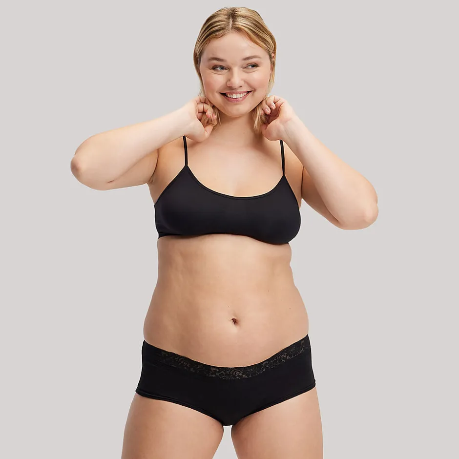 - Coloris noir uni avec finition en dentelle au niveau de la taille
