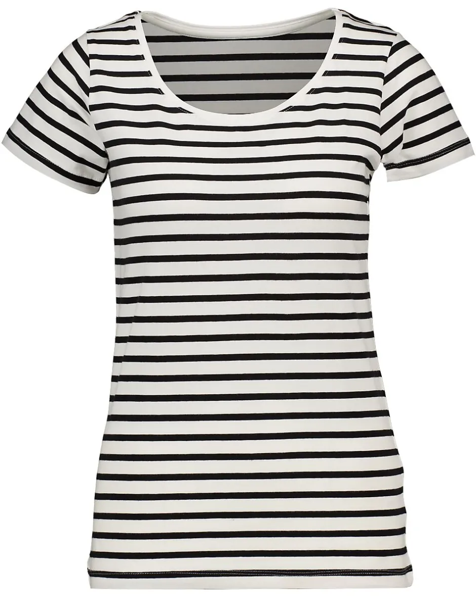 Ce t-shirt pour femme a un motif à rayures horizontales en blanc et noir et des manches courtes. L’encolure ronde et le tissu souple offrent un port confortable. Grâce au mélange de 80 % coton, 5 % élasthanne et 15 % coton recyclé, le t-shirt suit bien les mouvements du corps. Le tissu est doux sur la peau.